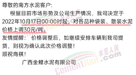廣西金鯉水泥通知10月17日0時(shí)起,對各品種袋裝、散裝水泥價(jià)格上調(diào)30元/噸。