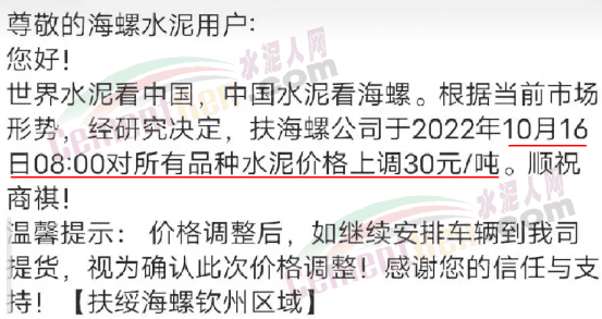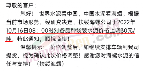 扶綏海螺欽州區(qū)域通知10月16日8時(shí)起,所有品種水泥價(jià)格上調(diào)30元/噸。