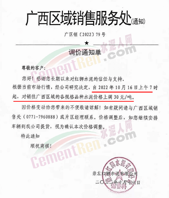 崇左紅獅水泥有限公司廣西區(qū)域銷售服務(wù)處通知,自10月16日上午7時(shí)起,對銷往廣西區(qū)域的各規(guī)格品種水泥價(jià)格上調(diào)30元/噸。