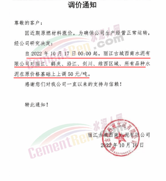 麗江古城西南水泥通知10月17日0時(shí)起,麗江古城西南水泥有限公司對麗江、鶴慶、沿江、劍川、維西區(qū)域所有品種水泥價(jià)格上調(diào)50元/噸。