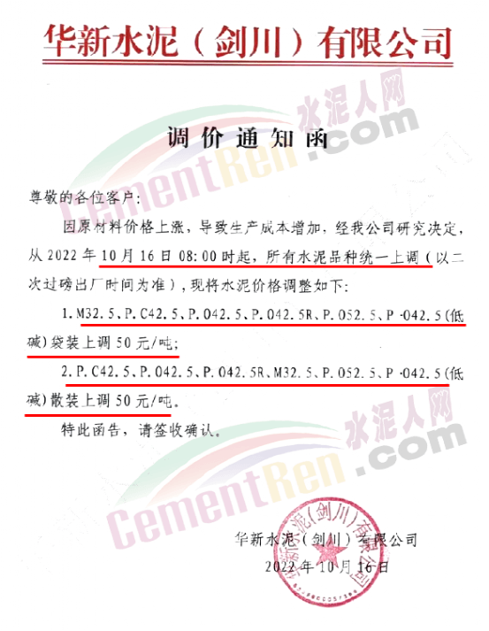 云南華新水泥(劍川)有限公司通知,10月16日8時(shí)起,所有水泥品種統(tǒng)一上調(diào)50元/噸。