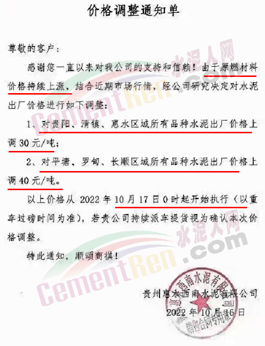 貴州惠水西南水泥通知,由于原燃材料價(jià)格持續(xù)上漲,自10月17日0時(shí)開始,對貴陽、清鎮(zhèn)、惠水區(qū)域水泥出廠價(jià)格上調(diào)30元/噸。對平塘、羅甸、長順區(qū)域所有品種水泥出廠價(jià)格上調(diào)40元/噸。