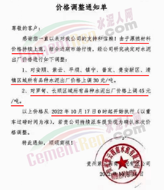 貴州紫云西南水泥有限公司通知,由于原燃材料價(jià)格持續(xù)上漲,結(jié)合近期市場行情,經(jīng)公司研究決定10月17日0時(shí)起對安順、紫云、平壩、鎮(zhèn)寧、普定、貴安新區(qū)、清鎮(zhèn)區(qū)域所有品種水泥出廠價(jià)上調(diào)30元/噸。對羅甸、長順區(qū)域所有品種水泥出廠價(jià)上調(diào)45元/噸。