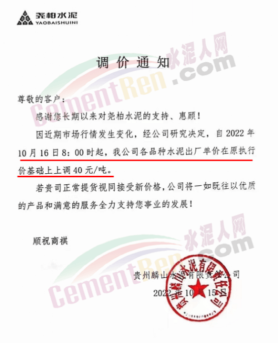 貴州麟山水泥有限公司通知,自10月16日0時(shí)起,公司各品種水泥出廠單位在原執(zhí)行價(jià)格基礎(chǔ)上上調(diào)40元/噸。