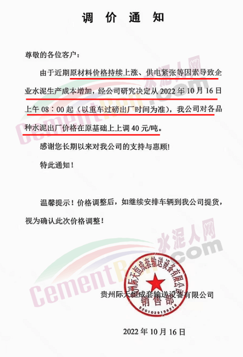 貴州際天恒成套輸送設(shè)備有限公司通知,由于近期原材料價(jià)格持續(xù)上漲、供電緊張等因素導(dǎo)致企業(yè)水泥生產(chǎn)成本增加。經(jīng)公司研究決定從10月16日上午8時(shí)起,對各品種水泥出廠價(jià)上調(diào)40元/噸。