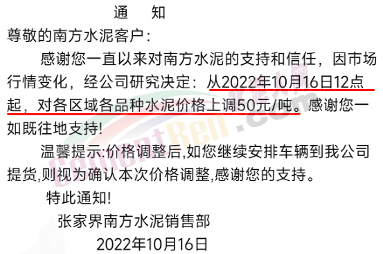 湖南張家界南方水泥銷售部通知10月16日12時(shí)對各區(qū)域各品種水泥價(jià)格上調(diào)50元/噸。