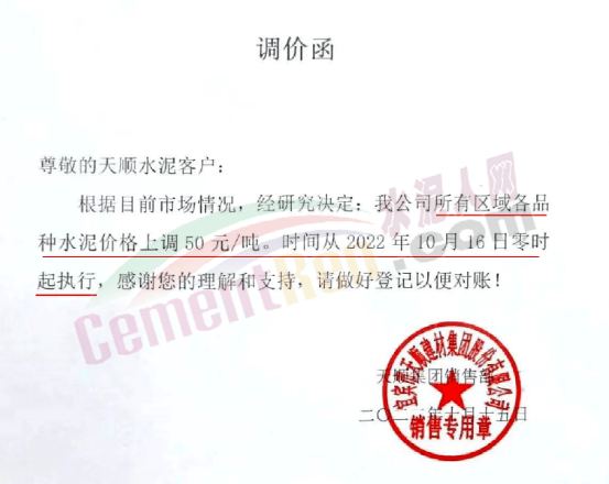 四川宜賓市天順建材集團(tuán)股份有限公司通知自10月16日零時(shí)起,所有區(qū)域各品種水泥價(jià)格上調(diào)50元/噸。