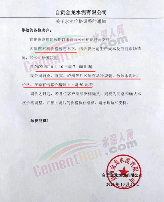 自貢金龍水泥有限公司通知因原燃材料價(jià)格居高不下,結(jié)合公司生產(chǎn)成本及當(dāng)前市場情況,經(jīng)公司研究決定10月16日上午7時(shí)起,自貢、宜賓、瀘州片區(qū)所有品種袋裝、散裝水泥出廠價(jià)上調(diào)50元/噸。