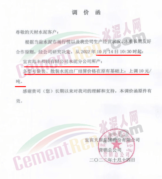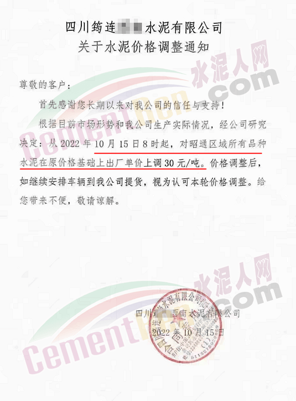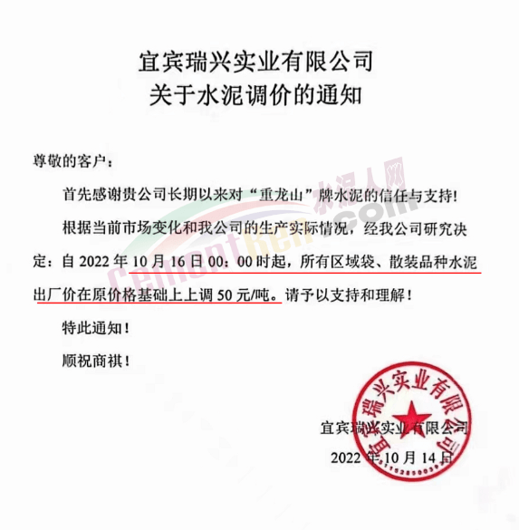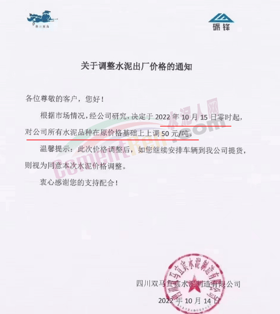 四川雙馬宜水泥制造有限公司通知10月15日零時(shí)起對公司所有水泥品種上調(diào)50元/噸。