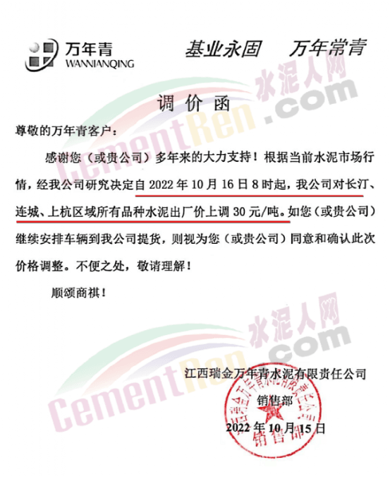 江西瑞金萬年青水泥有限責(zé)任公司通知10月16日8時(shí)起,公司對長汀、連城、上杭區(qū)域所有品種水泥出廠價(jià)上調(diào)30元/噸。