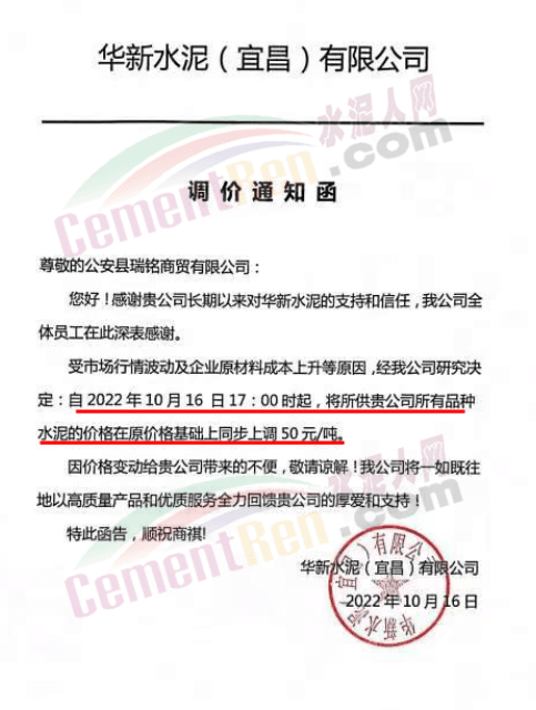 湖北華新水泥(宜昌)有限公司通知10月16日17時(shí)起,各標(biāo)號(hào)水泥上調(diào)50元/噸。