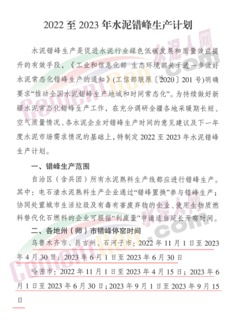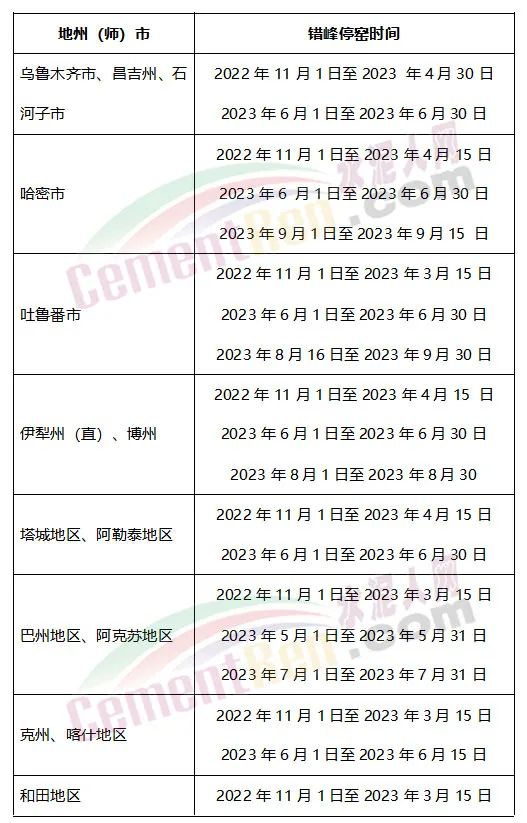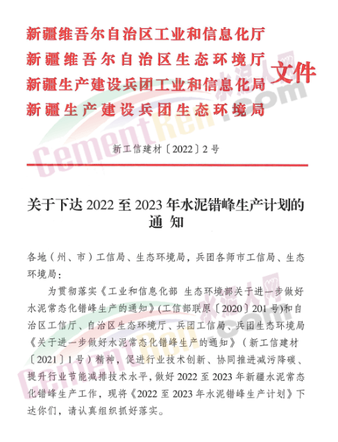 新疆維吾爾自治區(qū)發(fā)《關(guān)于下達(dá)2022至2023年水泥錯(cuò)峰生產(chǎn)計(jì)劃的通知》稱,為持續(xù)做好新疆水泥常態(tài)化錯(cuò)峰生產(chǎn)工作,在充分調(diào)研全疆各地采暖期長短、空氣質(zhì)量情況、各水泥企業(yè)對錯(cuò)峰生產(chǎn)時(shí)間的意見建議及下一年度水泥市場需求情況的基礎(chǔ)上,特制定2022至2023年水泥錯(cuò)峰生產(chǎn)計(jì)劃。