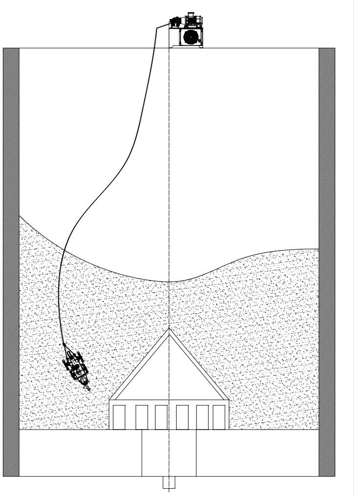 將機器人從堵料的水泥庫頂部用牽引繩放入庫內(nèi),到達料面以后,啟動系統(tǒng), 機器人根據(jù)庫外遠程遙控操作系統(tǒng)和內(nèi)置陀螺儀到達堵料的位置,即可啟動掘進驅(qū)動馬達和行走送料馬達,掘進頭在掘轉(zhuǎn)過程中,將凝結(jié)成塊的水泥切割松散; 需要調(diào)整機器人前進方向時,可以通過控制兩組后驅(qū)動馬達,即可調(diào)整到方向。機箱尾部有防翻轉(zhuǎn)尾舵,可以保證機器人穩(wěn)定的作業(yè)姿態(tài),并且尾舵不影響機器人的前進和后退作業(yè)。