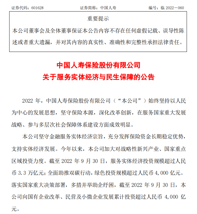 除國(guó)有大行外,中國(guó)人壽保險(xiǎn)16日也發(fā)布公告稱,充分發(fā)揮保險(xiǎn)資金長(zhǎng)期穩(wěn)定優(yōu)勢(shì),支持實(shí)體經(jīng)濟(jì)發(fā)展。截至9月末,該公司服務(wù)實(shí)體經(jīng)濟(jì)投資規(guī)模超過(guò)人民幣3.3萬(wàn)億元;在全國(guó)承辦200多個(gè)大病保險(xiǎn)項(xiàng)目,覆蓋近3.5億人。