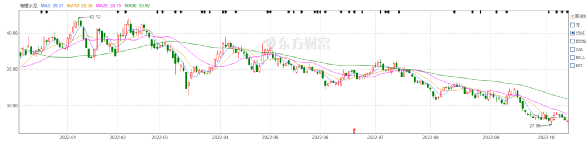 2022年內(nèi)最高值(2022年1月10日盤中最高價(jià)44.5元)到2022年10月20日開(kāi)盤27.8元市值下跌了884.98億元。較2020年7月31日盤中最高63.5元,市值更是下跌了1895.03億元。