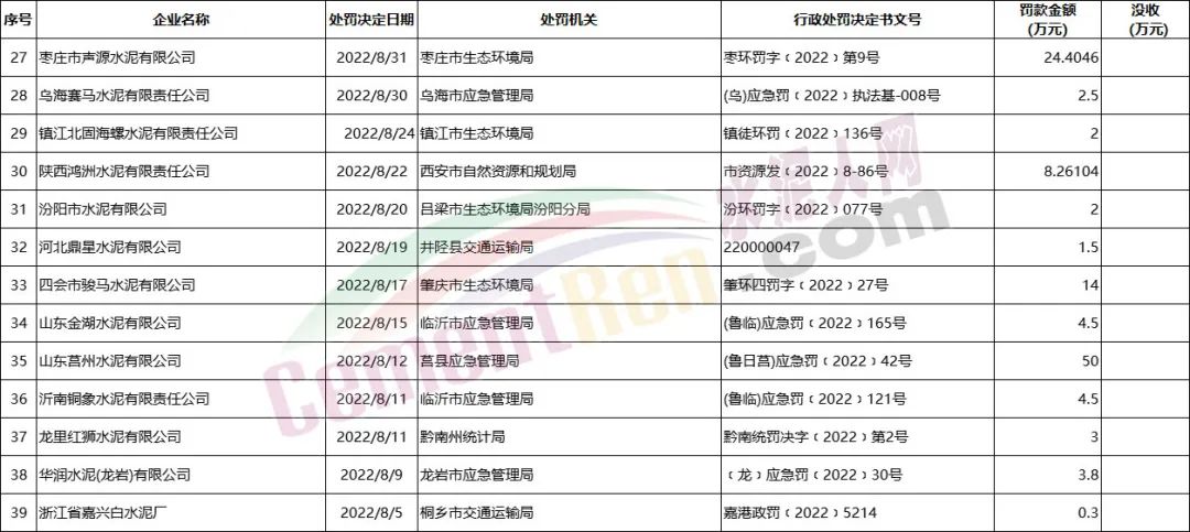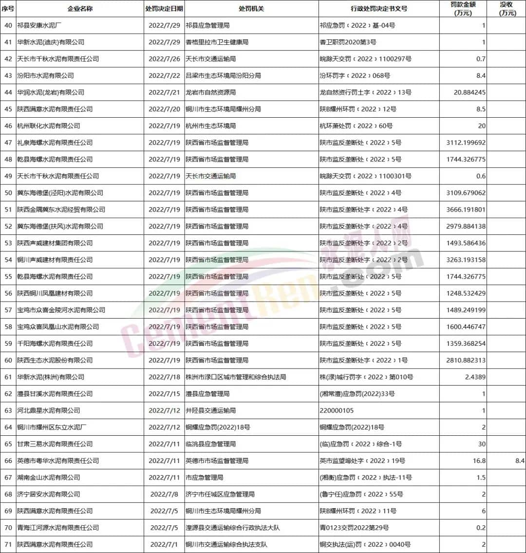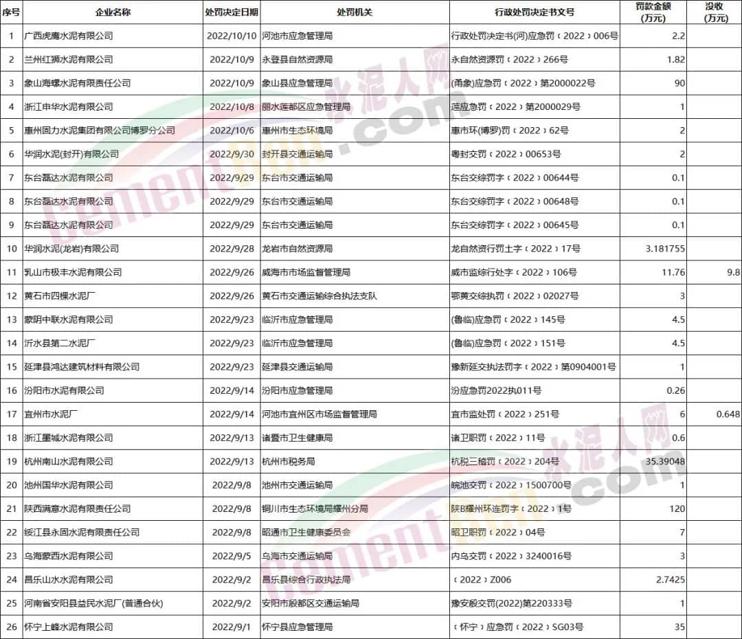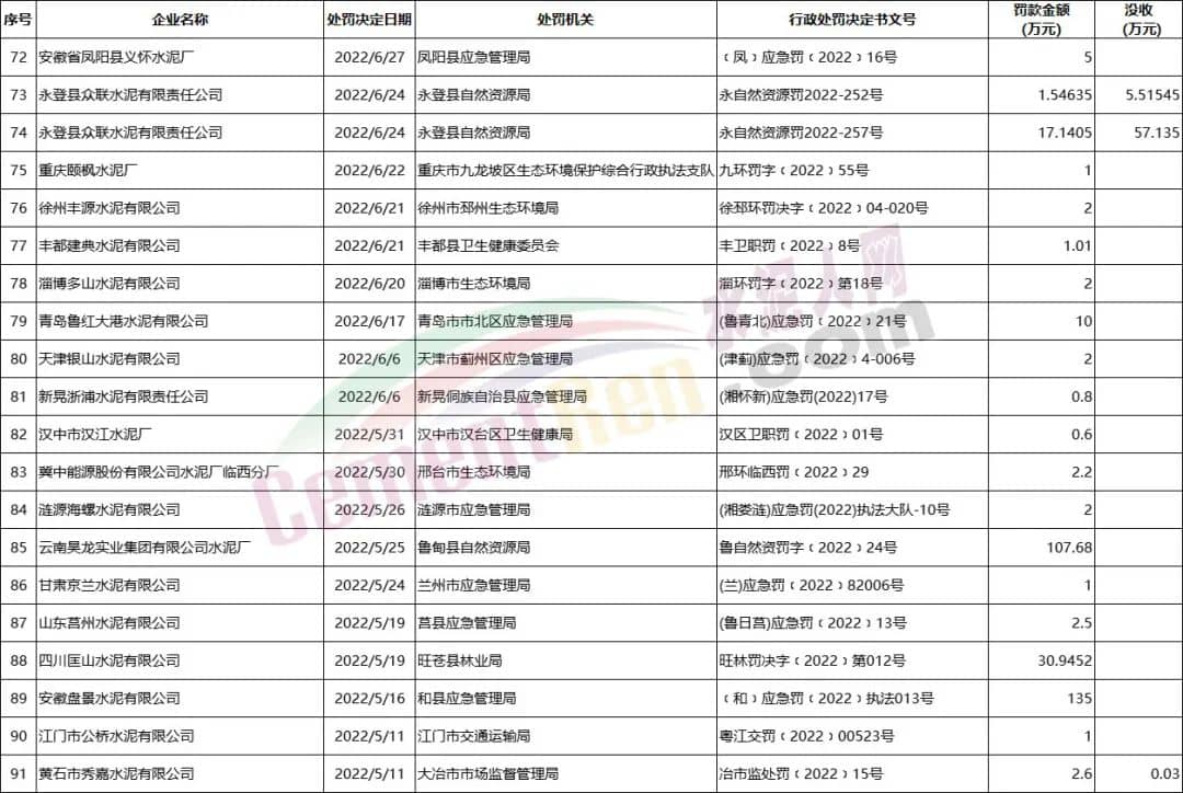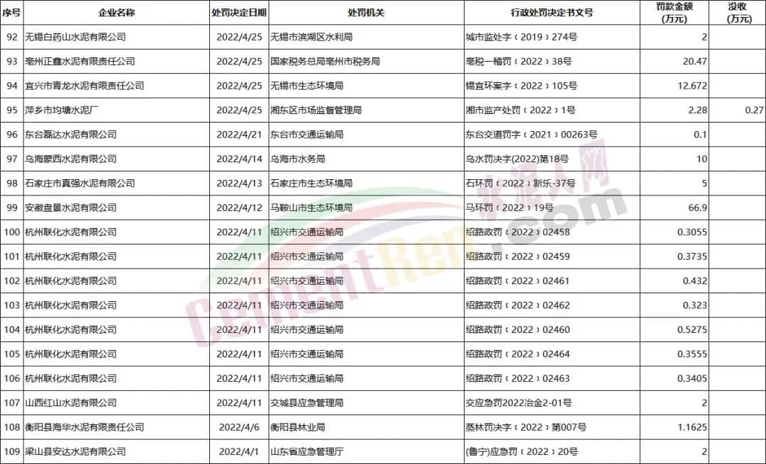 2022年1月至今部分涉及水泥企業(yè)罰沒(méi)案