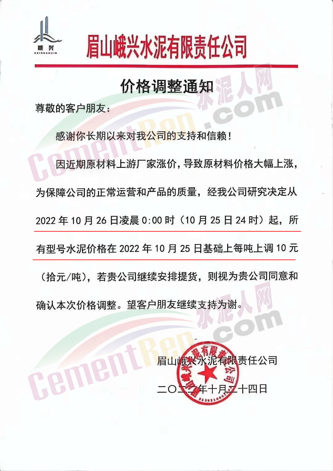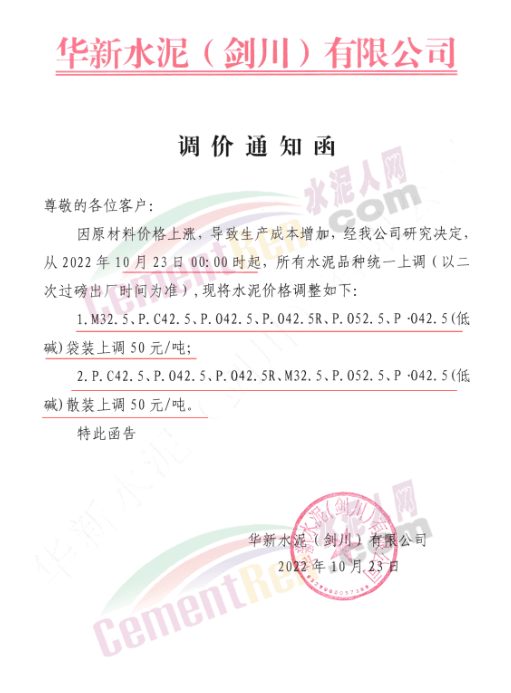 華新水泥(郴州)有限公司通知10月25日起對(duì)郴州區(qū)域所有包裝供貨價(jià)格上調(diào)20元/噸。