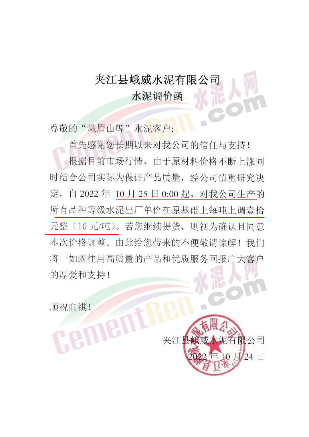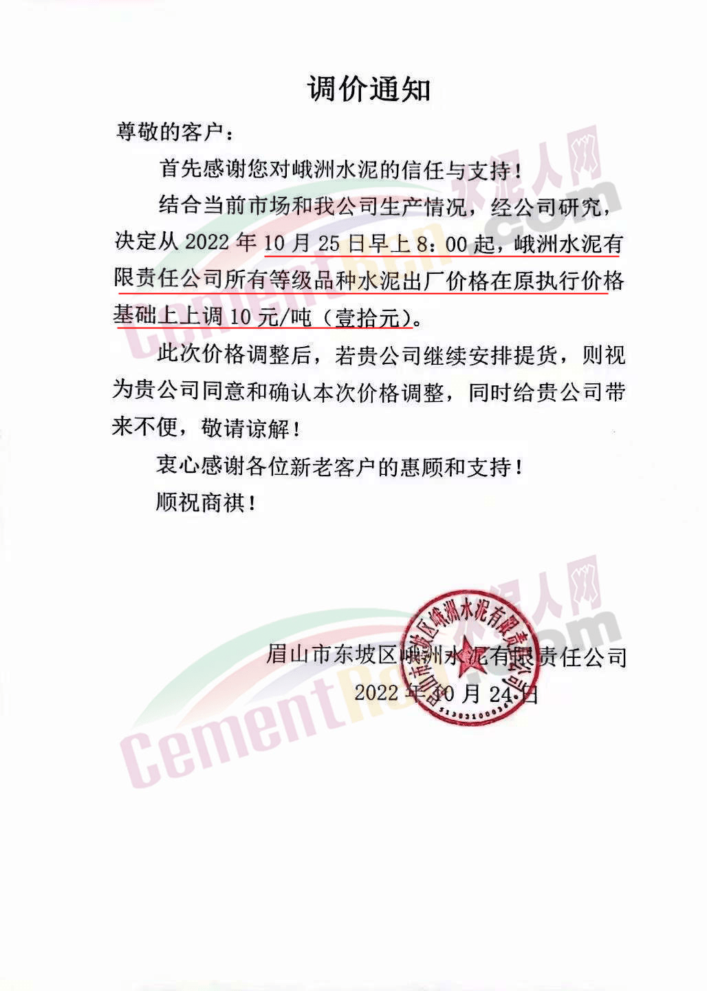 云南省大理白族自治州南澗縣金球建材有限責(zé)任公司通知,受原材料價(jià)格上漲,電力供應(yīng)受限,導(dǎo)致公司水泥生產(chǎn)成本上漲。自10月23日0時(shí)起上調(diào)50元/噸。