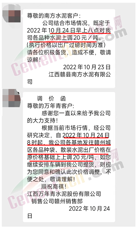 江西贛州區(qū)域主要品牌企業(yè)萬(wàn)年青水泥、南方水泥通知24日起上調(diào)20元/噸。