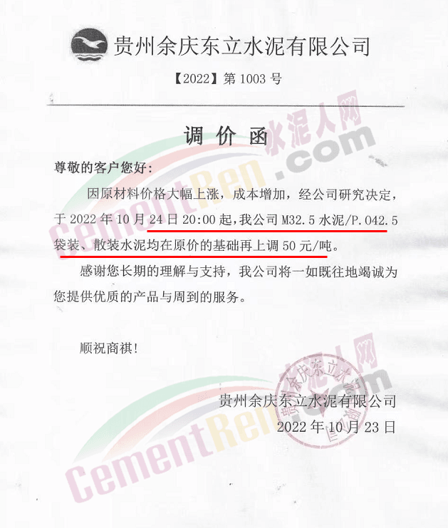 貴州余慶東立水泥有限公司通知,24日20時(shí)起,公司各標(biāo)號(hào)水泥上調(diào)50元/噸。