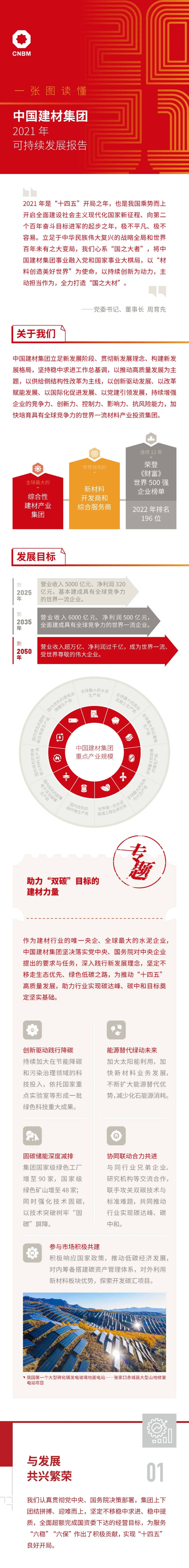 中國建材集團正式發(fā)布了2021可持續(xù)發(fā)展報告,這是集團的第13本可持續(xù)發(fā)展報告。報告分為上下兩個篇章,從“與發(fā)展共興繁榮、與科技共創(chuàng)未來、與自然共生和諧、與員工共同成長、與社會共赴美好、與責任共話長青”六個維度來闡述責任理念及履責績效。這份報告被中國企業(yè)社會責任報告評級專家委員會評為"五星佳”級的最高評級。集團可持續(xù)發(fā)展報告連續(xù)七年獲得五星級、連續(xù)三年獲得“五星佳”級評價。