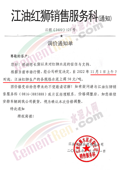 江油紅獅水泥、江油拉豪雙馬水泥、四川綿竹進(jìn)鑫化建有限責(zé)任公司通知,自11月1日上午上調(diào)水泥價(jià)格50元/噸。