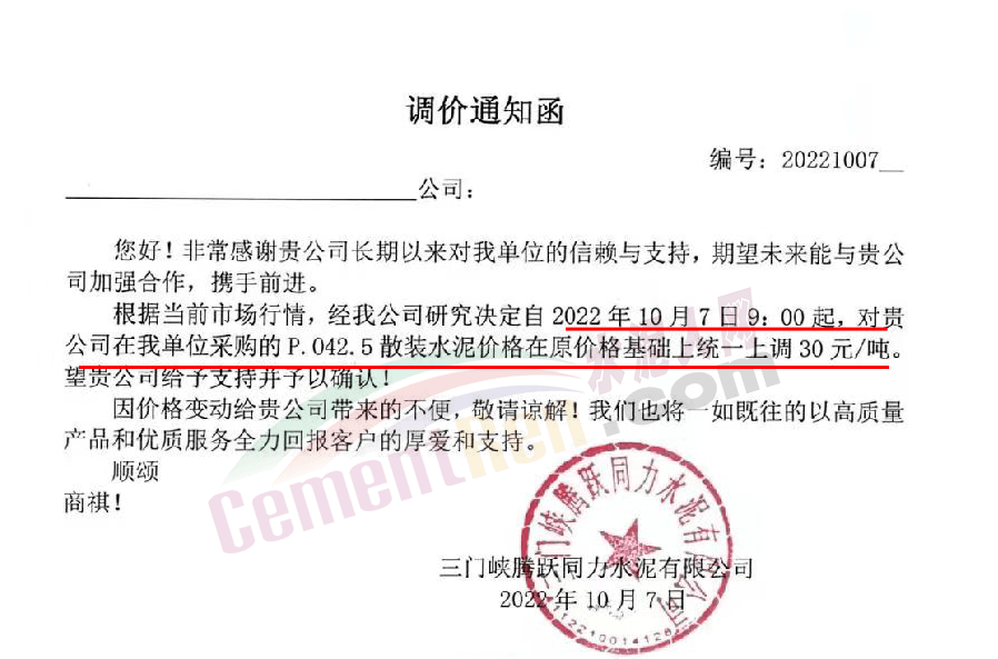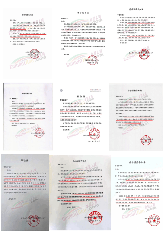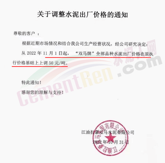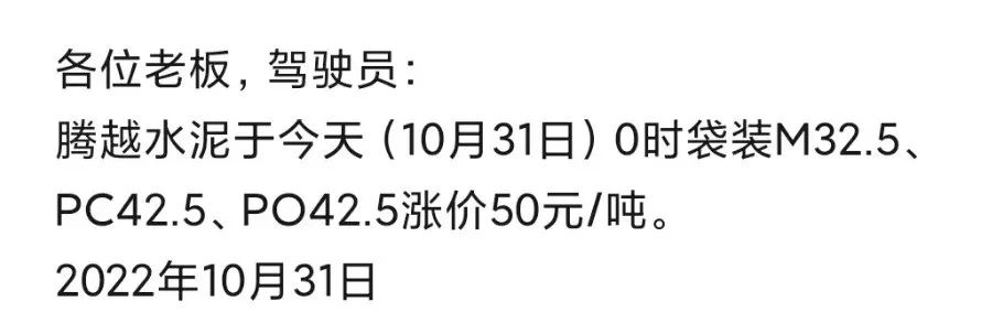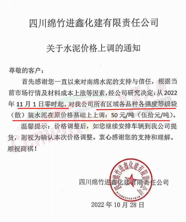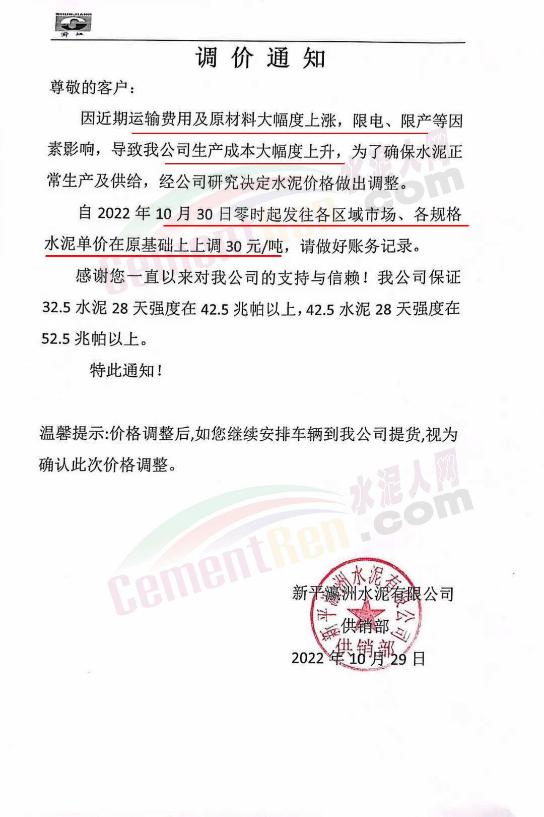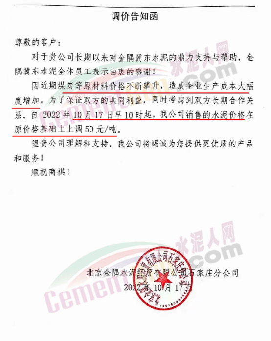 河北沙河市雙基水泥有限公司通知,由于疫情原因各原材料供應(yīng)不足、價(jià)格持續(xù)上漲,造成公司生產(chǎn)、銷售等環(huán)節(jié)的成本大幅度上升,經(jīng)公司研究決定自2022年10月12日起,上調(diào)50元/噸。