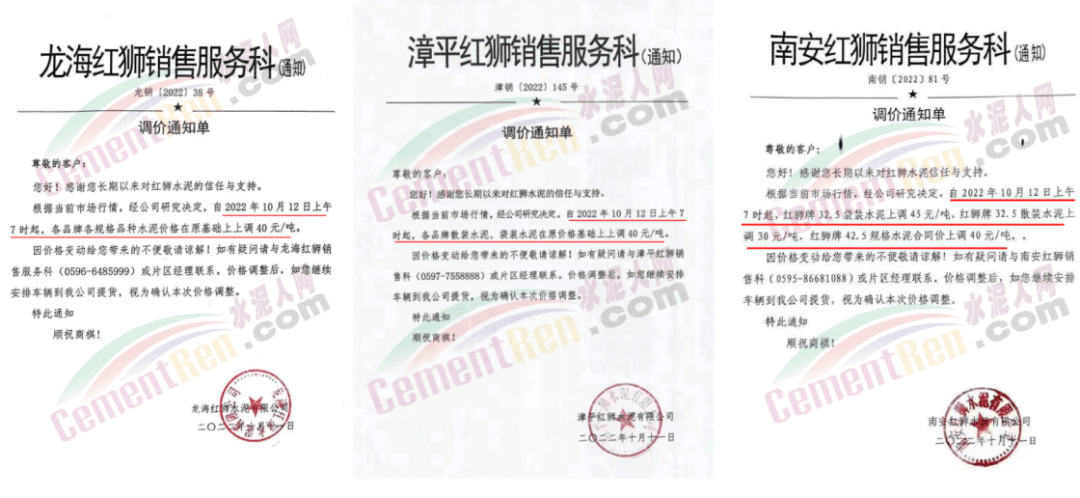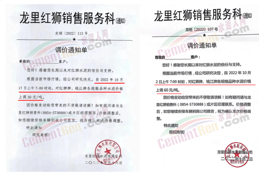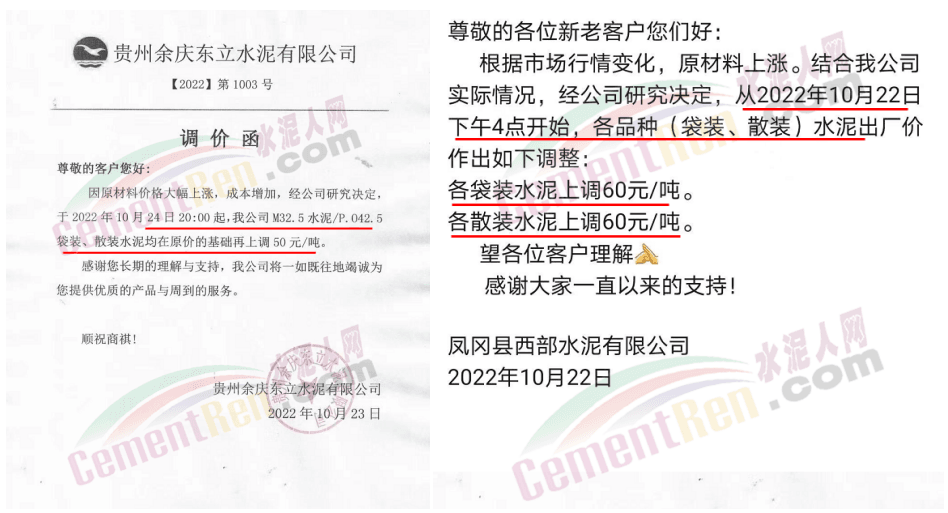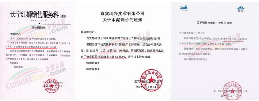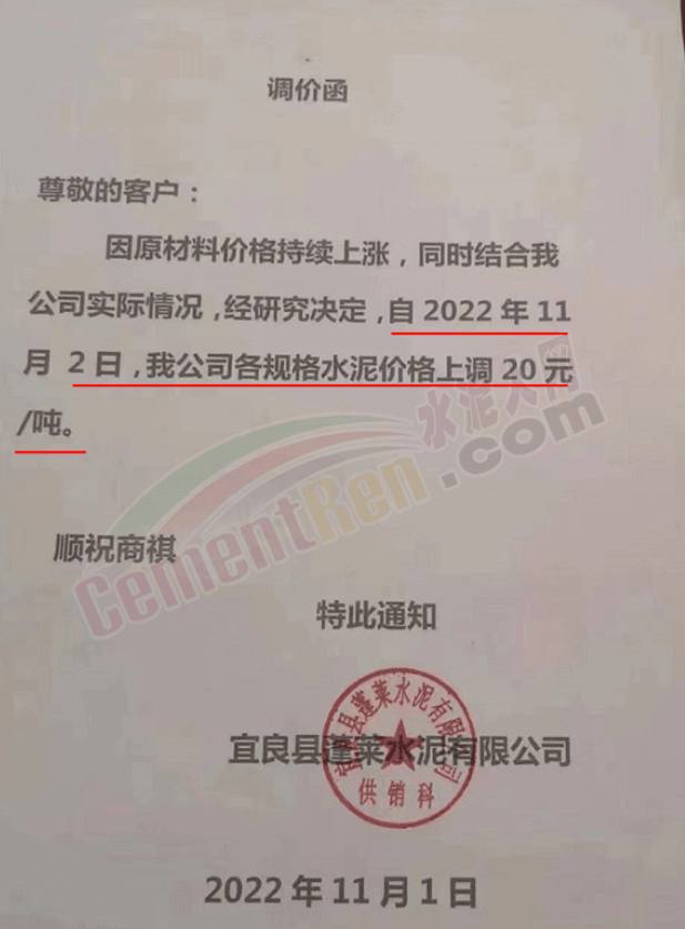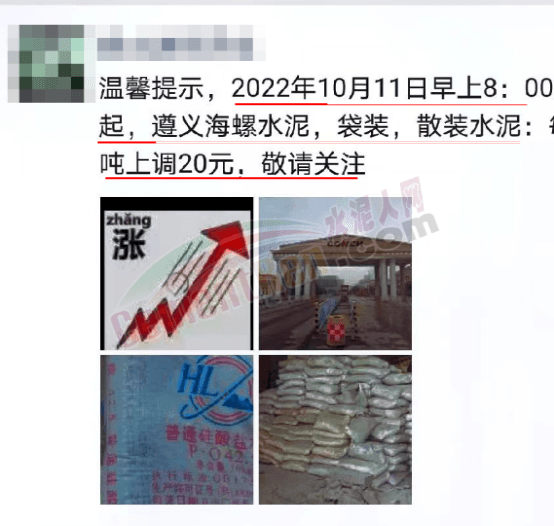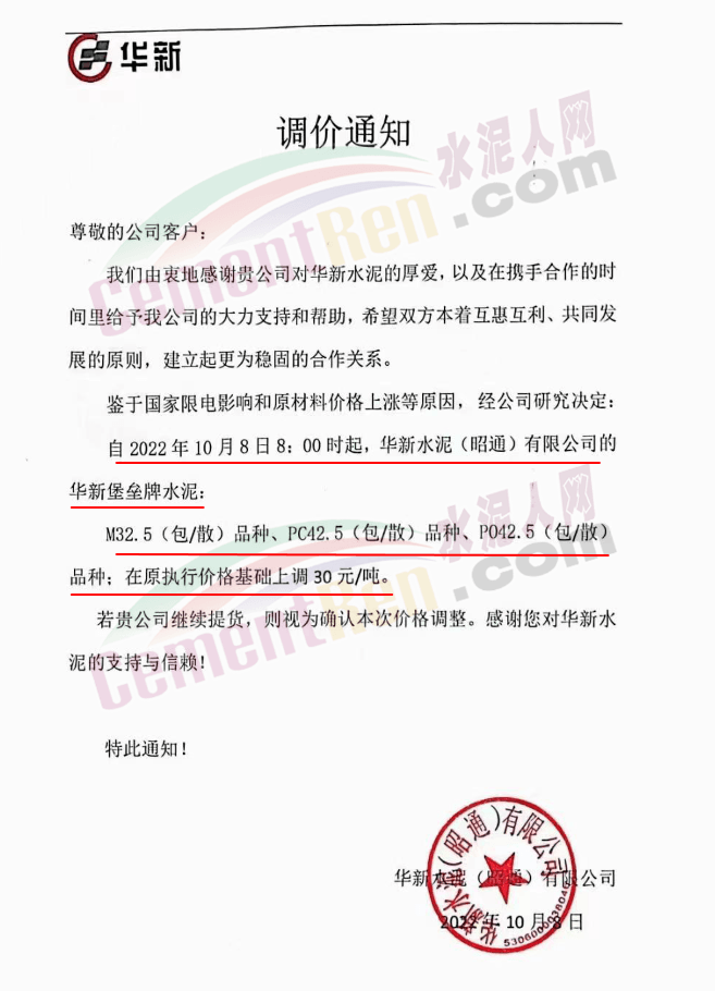 河北沙河市雙基水泥有限公司通知,由于疫情原因各原材料供應(yīng)不足、價(jià)格持續(xù)上漲,造成公司生產(chǎn)、銷售等環(huán)節(jié)的成本大幅度上升,經(jīng)公司研究決定自2022年10月12日起,上調(diào)50元/噸。