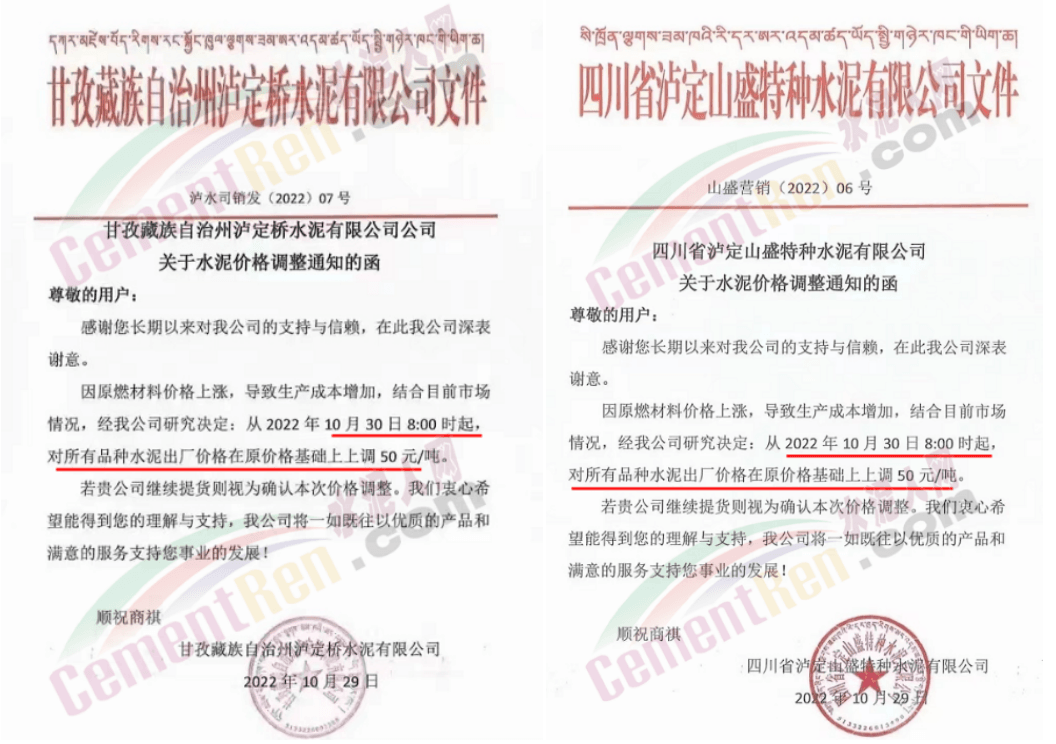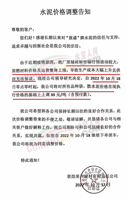 甘肅酒泉敦煌榮興建材有限責(zé)任公司通知,由于近期疫情原因,工廠原輔材料市場行情波動(dòng)較大,原燃材料價(jià)格及運(yùn)費(fèi)整體上漲,導(dǎo)致生產(chǎn)成本大幅上升且供應(yīng)無法保證,現(xiàn)經(jīng)公司領(lǐng)導(dǎo)研究決定,自10月18日起,公司將對所有品種袋、散水泥價(jià)格上調(diào)30元/噸。
