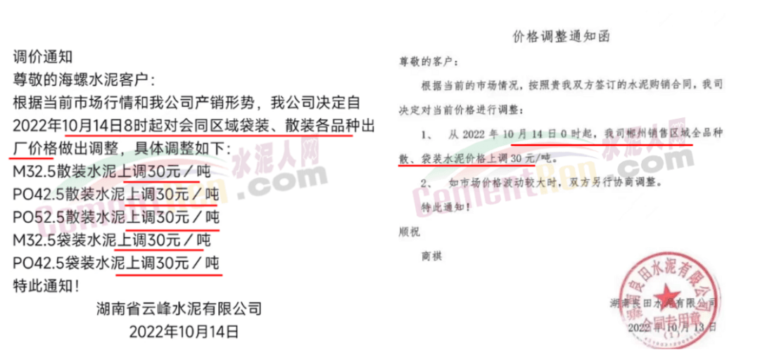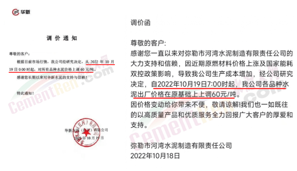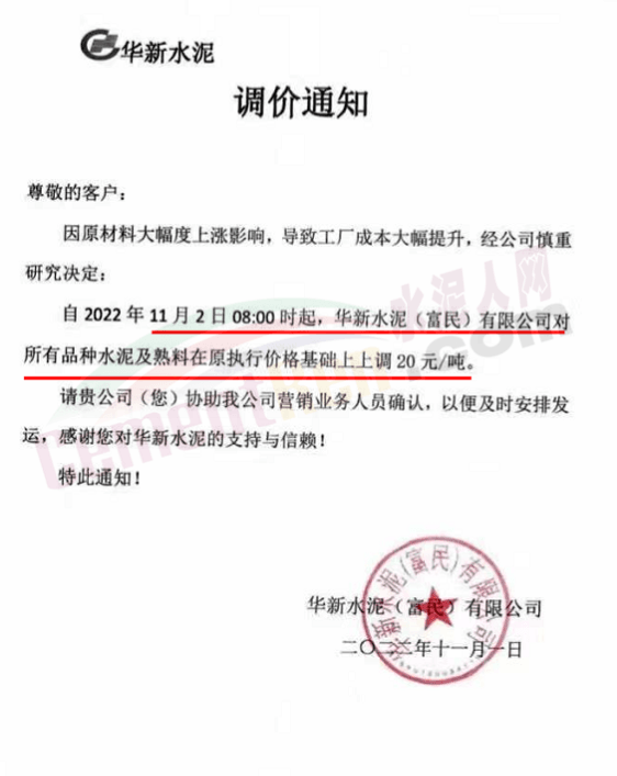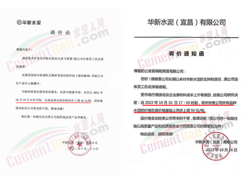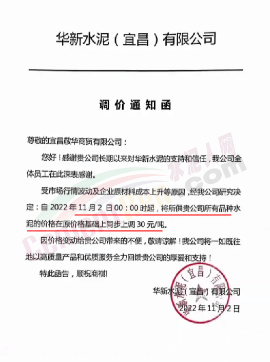湖北華新水泥襄陽公司通知10月29日上調(diào)30元/噸,10月中旬,華新宜昌公司通知10月16日上調(diào)水泥價(jià)格50元/噸。