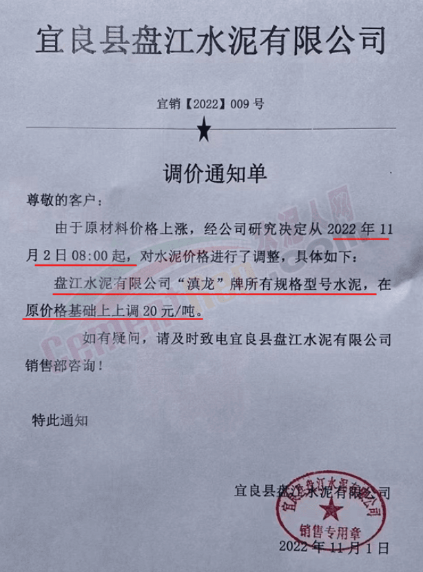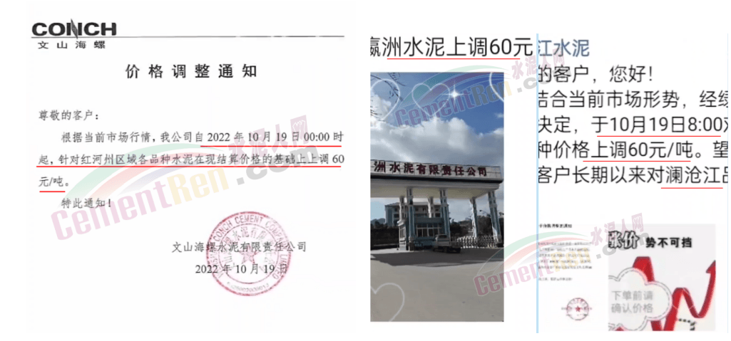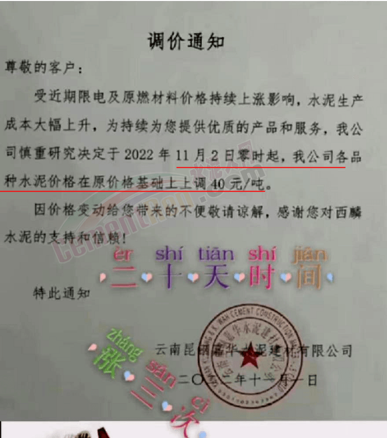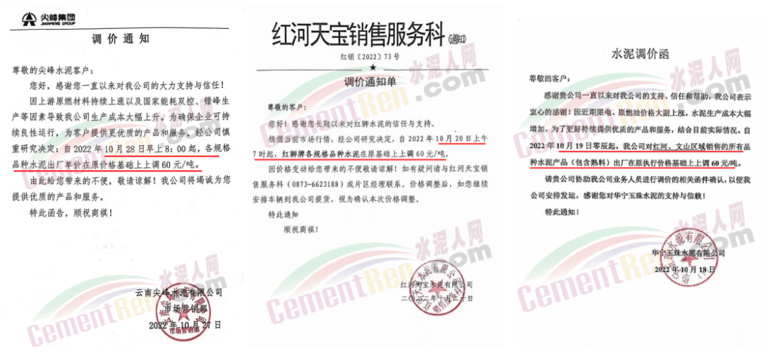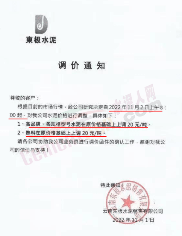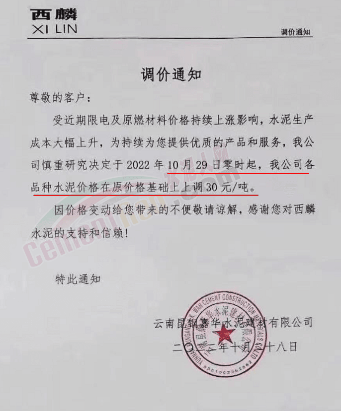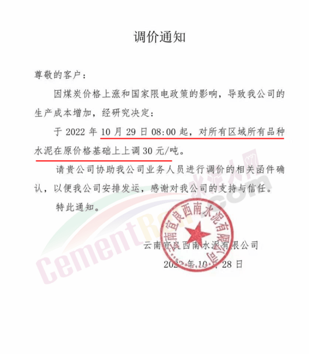 據(jù)了解,10月30日前后,云南區(qū)域海螺水泥、西南水泥、紅獅水泥、昆鋼嘉華、云南水泥建材集團(tuán)、華新水泥、尖峰集團(tuán)等多家企業(yè)也曾通知水泥價(jià)格上調(diào)30-80元/噸,部分企業(yè)熟料報(bào)價(jià)同步上調(diào)60元/噸。