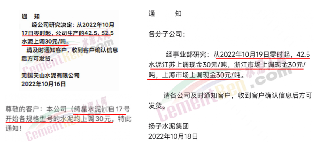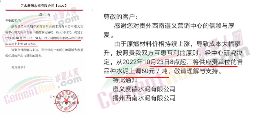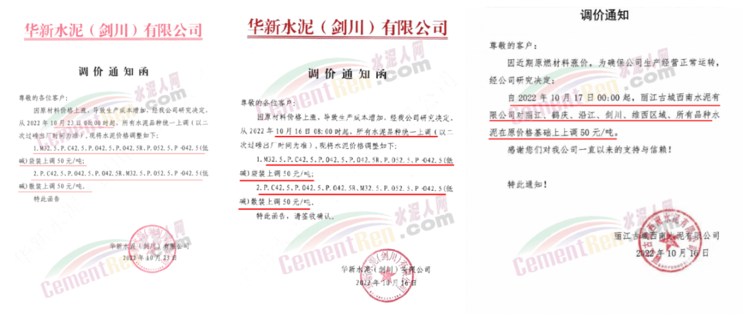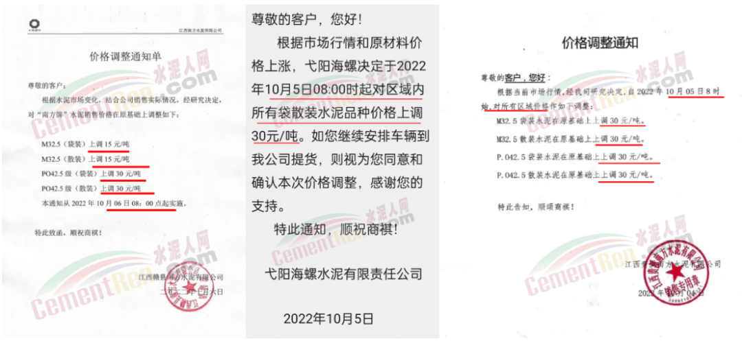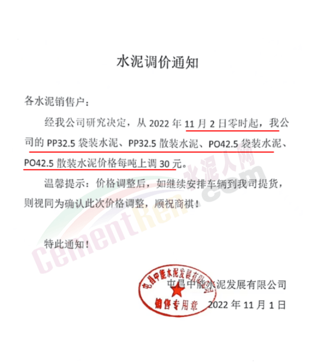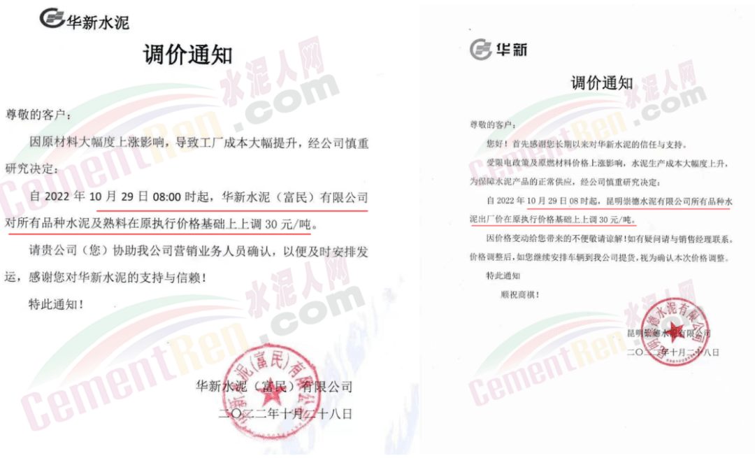 據(jù)了解,10月30日前后,云南區(qū)域海螺水泥、西南水泥、紅獅水泥、昆鋼嘉華、云南水泥建材集團(tuán)、華新水泥、尖峰集團(tuán)等多家企業(yè)也曾通知水泥價(jià)格上調(diào)30-80元/噸,部分企業(yè)熟料報(bào)價(jià)同步上調(diào)60元/噸。