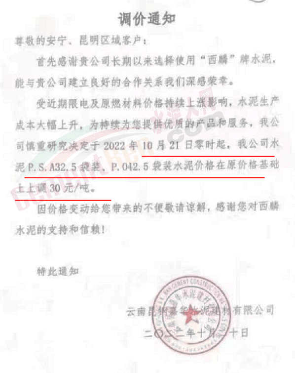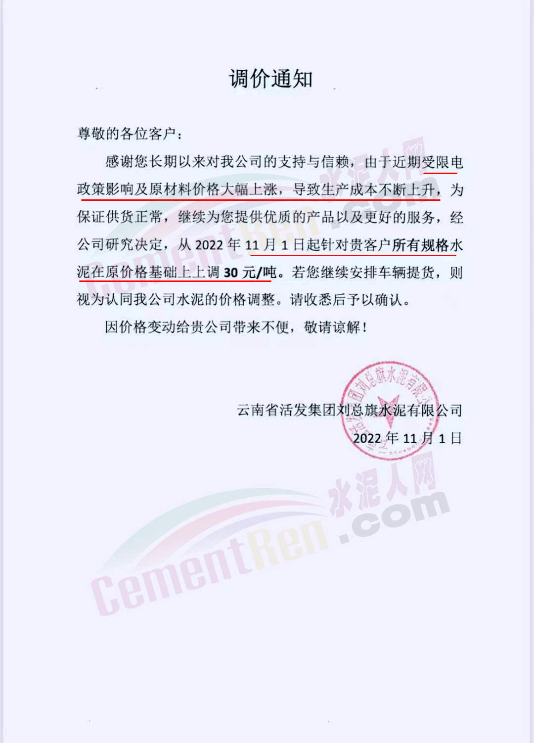 云南省活發(fā)集團(tuán)劉總旗水泥有限公司通知,受限電政策影響及原材料價(jià)格大幅上漲,導(dǎo)致生產(chǎn)成本不斷上升,水泥價(jià)格自11月1日起上調(diào)30元/噸。