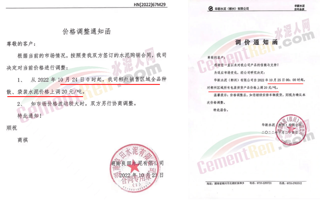 湖南華潤良田水泥、華新水泥等通知10月24日起上調(diào)水泥價(jià)格20元/噸。區(qū)域內(nèi)主要品牌企業(yè)華潤良田、雙峰海螺、云峰水泥、紅獅水泥旗下康達(dá)湖南都曾于10月中旬通知上調(diào)水泥價(jià)格30元/噸,兩次累計(jì)上調(diào)50元/噸。