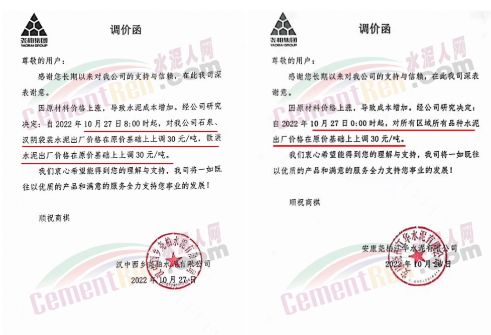 漢中主要品牌企業(yè),中材漢江水泥、漢中堯柏水泥有限公司曾通知自10月1日起,對漢中區(qū)域所有袋裝品種水泥價(jià)格上調(diào)20元/噸。