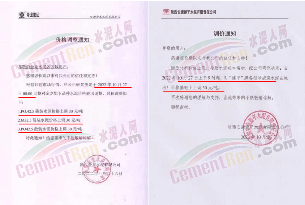 陜西堯柏水泥、金龍水泥、中材漢江等多家企業(yè)通知上調(diào)水泥價(jià)格20元-30元/噸。堯柏、金龍等水泥企業(yè)通知于10月27日上調(diào)水泥價(jià)格30元/噸。