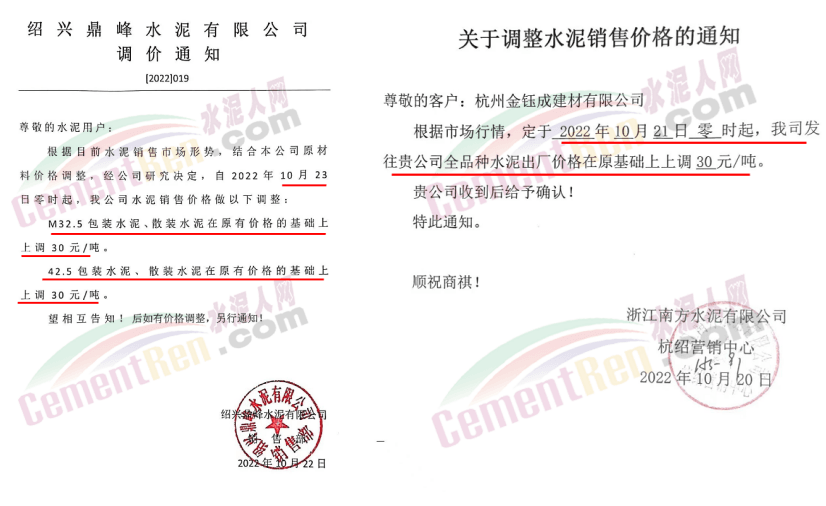 10月20日前后浙江杭州、紹興區(qū)域水泥企業(yè)通知上調(diào)水泥價(jià)格30元/噸。