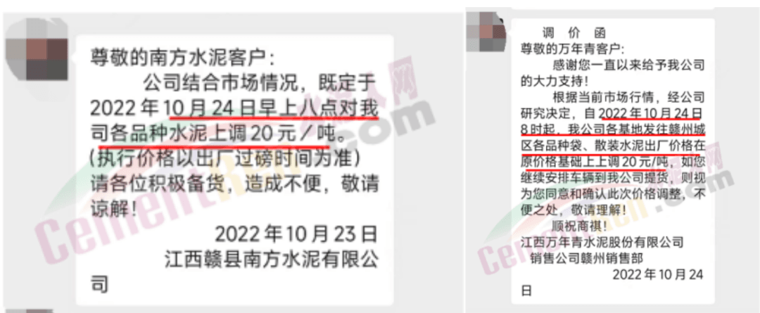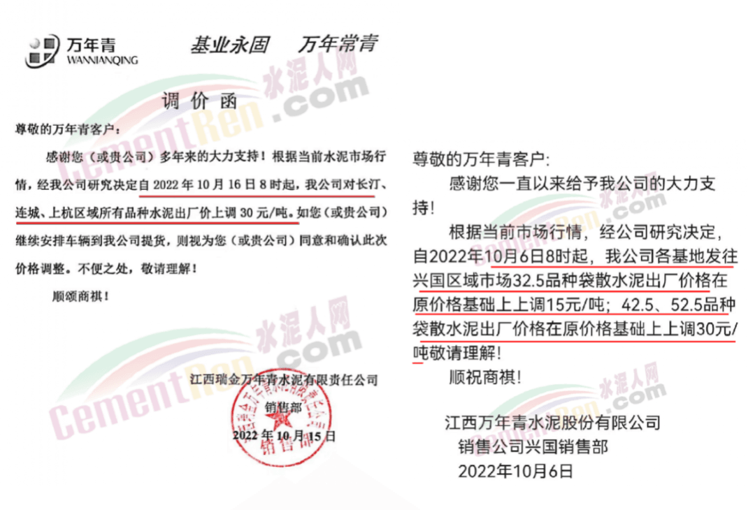 江西瑞金萬年青水泥有限責(zé)任公司通知10月16日起,公司對長汀、連城、上杭區(qū)域所有品種水泥出廠價(jià)上調(diào)30元/噸。