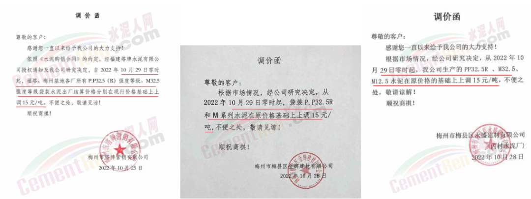 10月29日前后廣東梅州區(qū)域包括塔牌水泥在內(nèi)的多家企業(yè)通知上調(diào)水泥價(jià)格15元/噸;10月19日前后,華潤、海螺等曾上調(diào)水泥價(jià)格10-20元/噸;10月13日前后主要品牌企業(yè)通知上調(diào)中山、珠海、江門區(qū)域水泥價(jià)格10-20元/噸,個(gè)別企業(yè)月內(nèi)上調(diào)超50元/噸。