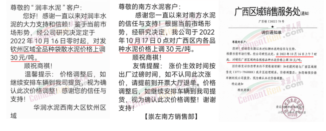 廣西區(qū)域華潤、海螺、南方、紅獅等主要品牌企業(yè)10月15日于前后通知上調(diào)水泥價(jià)格30元/噸