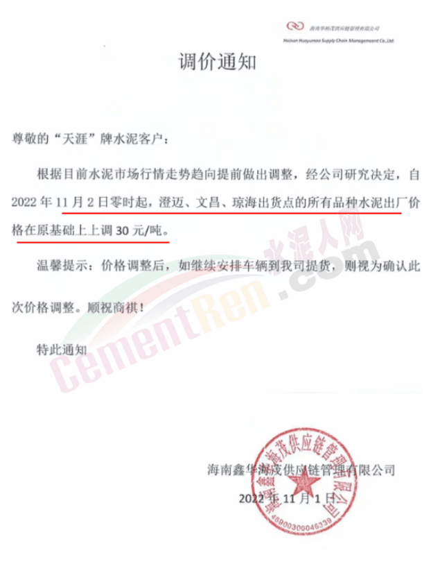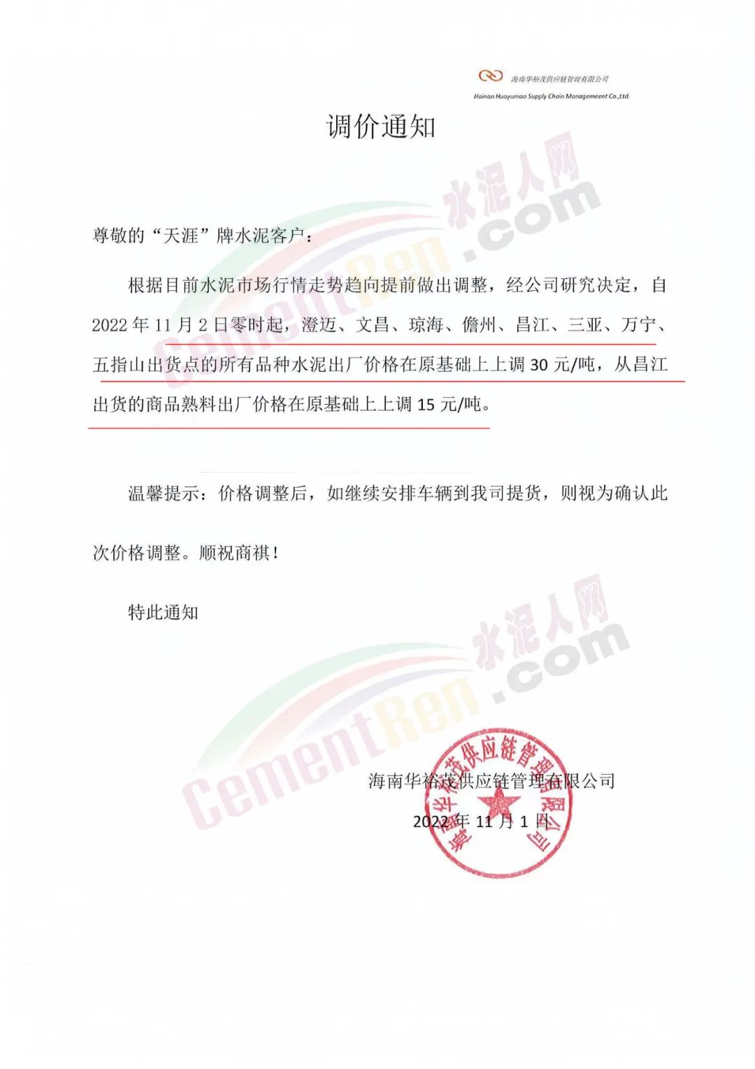 海南華裕茂供應(yīng)鏈管理有限公司通知,自2022年11月2日零時(shí)起,澄邁、文昌、瓊海、儋州、昌江、三亞、萬寧、五指山出貨點(diǎn)的所有品種水泥出廠價(jià)格在原基礎(chǔ)上上調(diào)30元/噸,從昌江出貨的商品熟料出廠價(jià)格在原基礎(chǔ)上上調(diào)15元/噸。