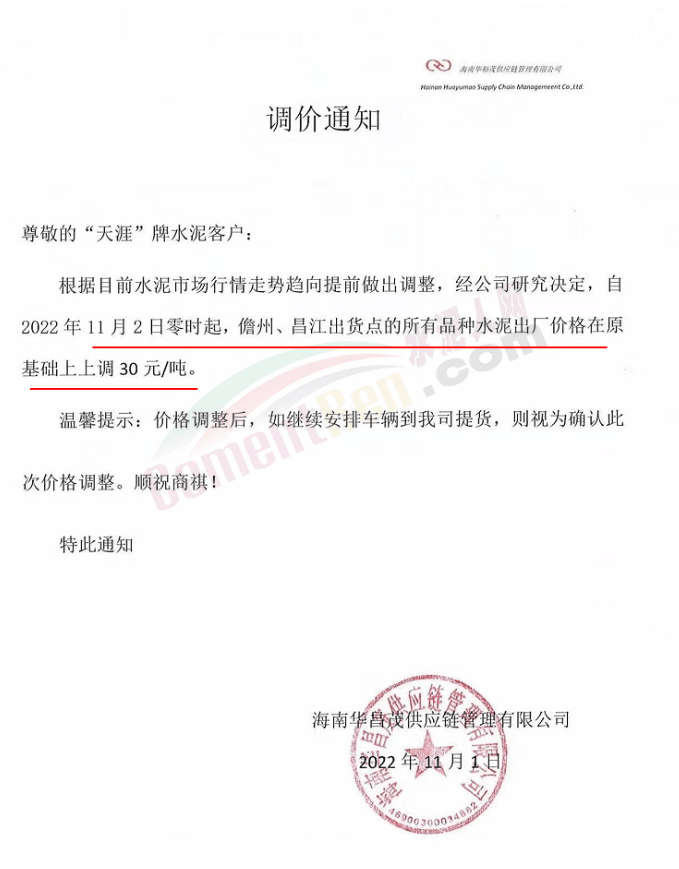 海南華昌茂供應(yīng)鏈管理有限公司通知11月2日起,儋州、昌江出貨點(diǎn)的所有品種水泥出廠價(jià)格在原基礎(chǔ)上上調(diào)30元/噸。