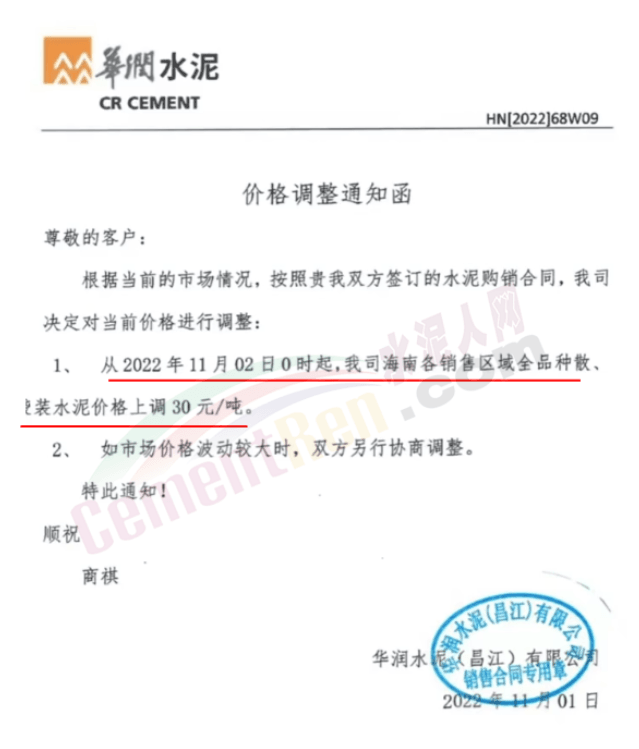 華潤水泥昌江公司通知,11月2日零時(shí)起,公司海南各銷售區(qū)域全品種水泥出廠價(jià)上調(diào)30元/噸。