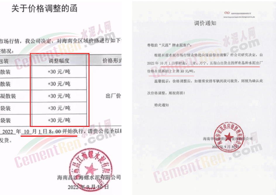 10月初,海南區(qū)域主要品牌企業(yè)海螺、華盛天涯、華潤水泥等曾通知上調(diào)水泥價(jià)格30元/噸,兩次累計(jì)上調(diào)60元/噸。