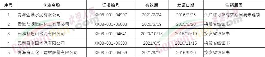 青海省注銷5家水泥企業(yè)生產(chǎn)許可證,其中一家許可證有效期屆滿未延續(xù),4家換發(fā)省級證書原證書注銷;