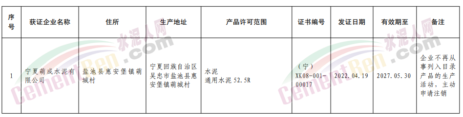 寧夏回族自治區(qū)注銷寧夏萌成水泥有限公司生產(chǎn)許可證,企業(yè)不再從事列入目錄產(chǎn)品的生產(chǎn)活動,主動申請注銷;