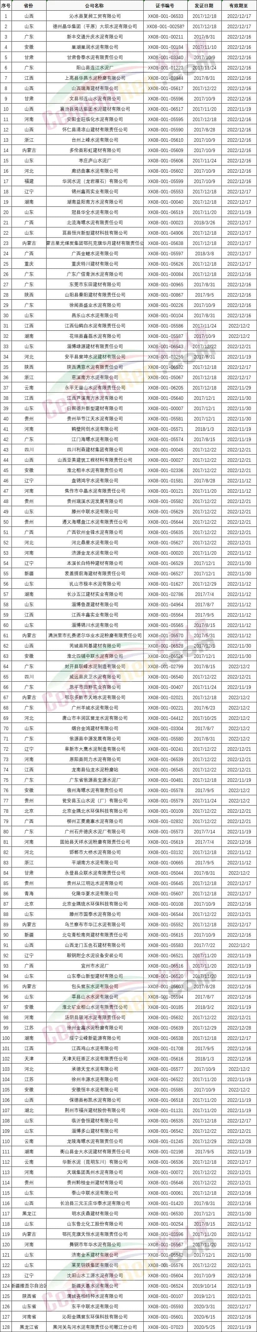 浙江省51個編號水泥生產(chǎn)許可證處于注銷狀態(tài);