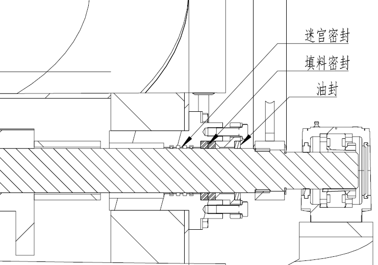 針對(duì)上述問題,HJ新型翻板閥設(shè)計(jì)思路是將密封和轉(zhuǎn)動(dòng)兩個(gè)相互矛盾問題拆開后分別處理。由內(nèi)而外設(shè)置迷宮、填料、油封三層密封結(jié)構(gòu)(見圖3)。其中迷宮、油封結(jié)構(gòu)不直接與轉(zhuǎn)動(dòng)軸接觸,迷宮結(jié)構(gòu)內(nèi)部設(shè)置引流環(huán),可提前大幅度卸去沖擊到填料上面的瞬時(shí)正壓,由于接觸填料的瞬時(shí)正壓變低,填料密封的效果更加顯著。設(shè)置在最外端的油封既可以減少外部粉塵進(jìn)入填料,也可以再次降低漏料幾率。