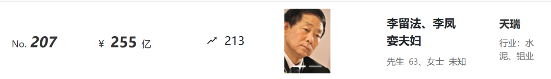 來自浙江的農(nóng)夫山泉創(chuàng)始人鐘睒睒,再次登上2022胡潤百富榜榜首,財富值達4550億元,創(chuàng)20多年來中國首富財富值最高紀錄。“水泥富豪天瑞集團的李留法、李鳳孌夫婦,以255億元財富位列207位;紅獅控股集團的章小華,以110億元的財富排名564位;臺泥的辜侯天儀家族以72億元財富位列894位。