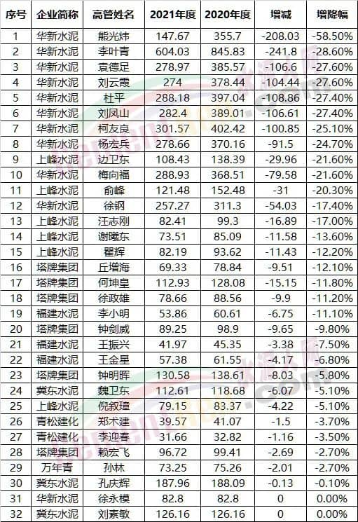 對比2020年,75位水泥上市公司高管中有30位薪酬下降,占比達40%。其中華新水泥副總裁熊光煒薪酬降幅達58.5%,總裁李葉青薪酬降幅為28.6%,降幅前11位高管薪酬降幅均在20%以上。